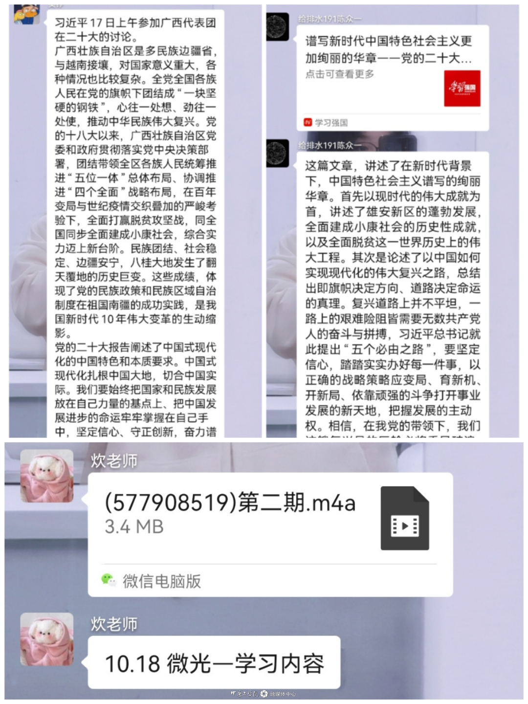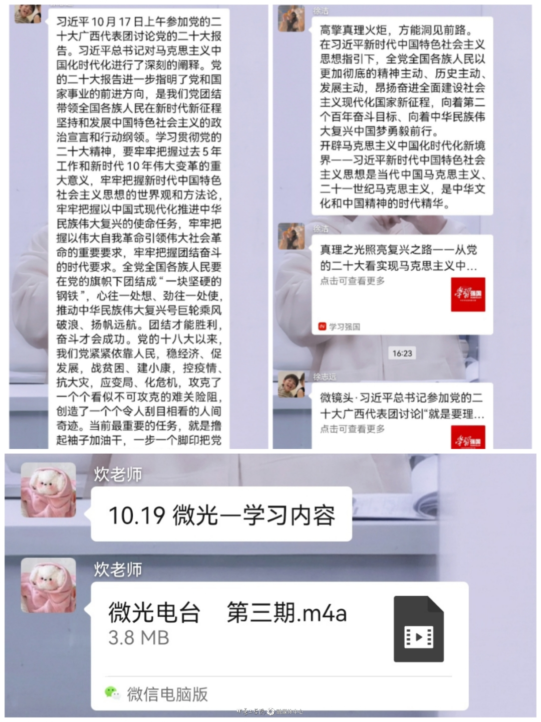 支部创新学习形式,创建“微光”播客学习平台,每天梳理大会动态,制作音频,发布在支部党员学习群。同时,还实时转发人民日报、新华社的权威报道,分享大会最新资讯,确保每位党员都能够及时学习知晓党的二十大动态。学习之余,支部全体党员采用线上学习理论和线下观看直播相结合的方式,谈体会、谈信念、谈责任,不断加深对党的二十大精神的感知理解。